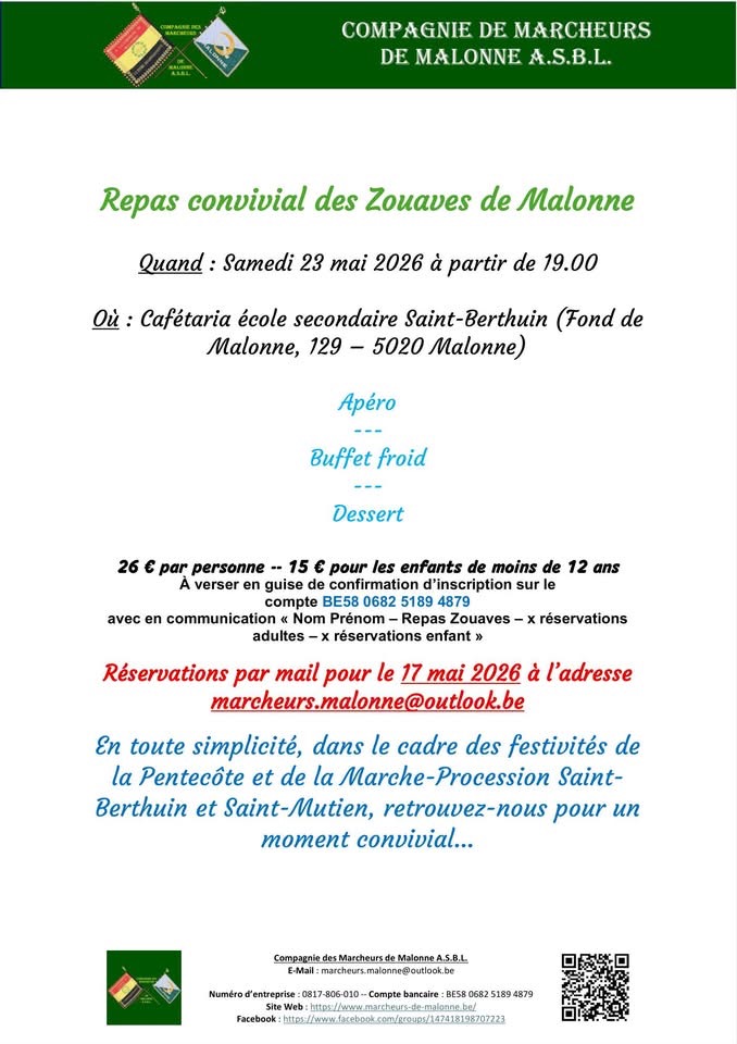 Outre le plaisir de vous rencontrer toutes et tous, ce repas nous permettra de réunir quelques fonds pour nous permettre de louer costumes et fusils pour les différentes marches prévues pour notre compagnie dont cette année, la Septennale Saint-Feuillen à Fosses-la-Ville1. Merci d'avance de votre présence.